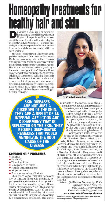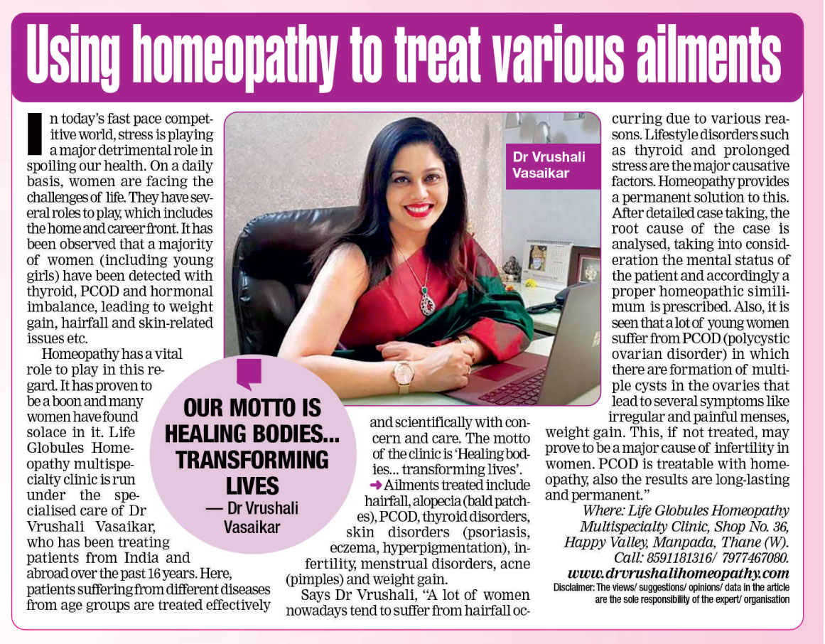 Life Globules is run under the specialized care of Dr. Vrushali Vasaikar who has been treating patients not only from Mumbai and Maharashtra but from all parts of India and even abroad... It is a super speciality clinic where patients with all diseases from all age groups are effectively and scientifically treated with concern and care..